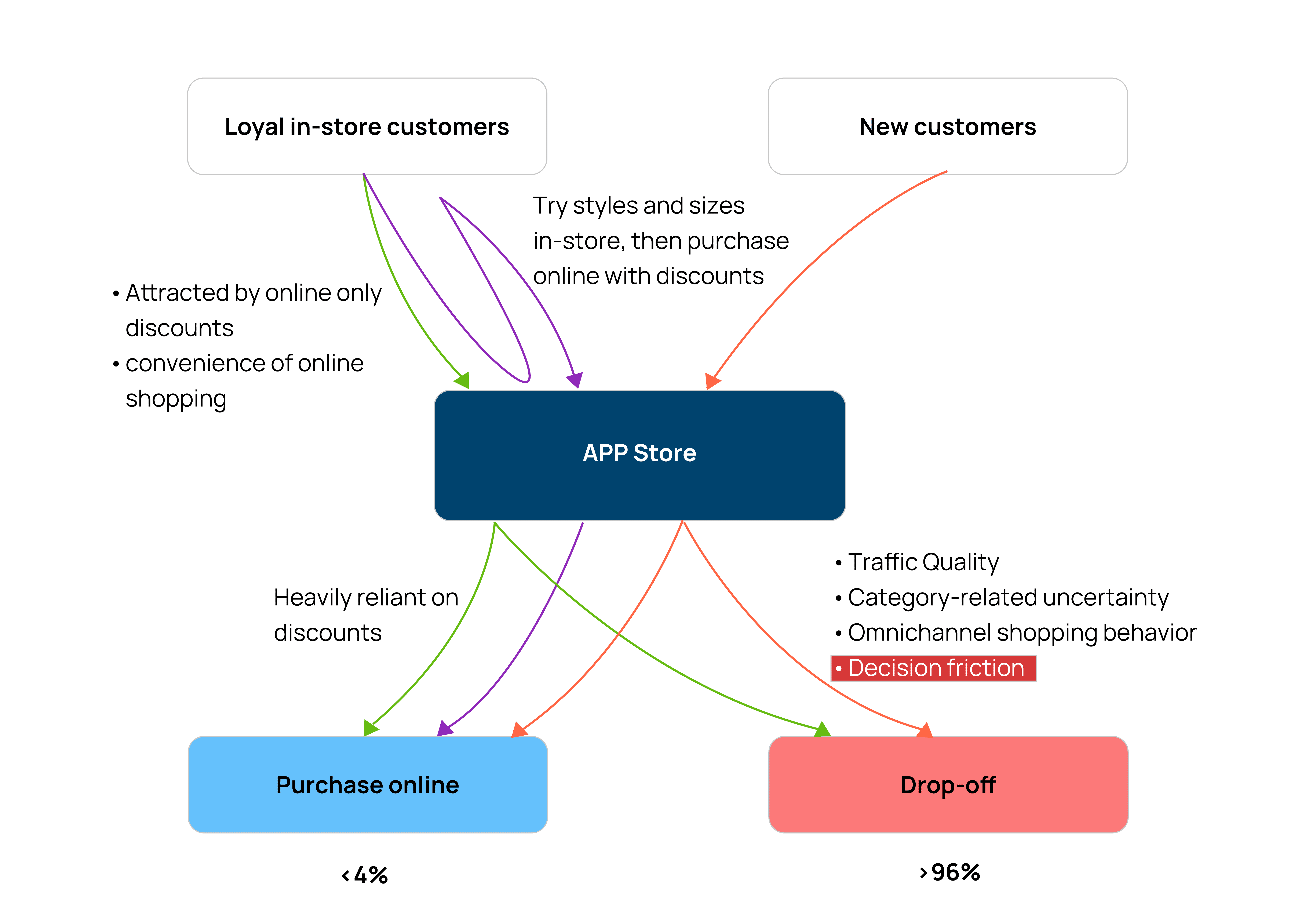 → To address this gap, this project focuses on understanding user behavior before checkout and identifying where decision-making breaks down. From a strategic product design perspective, it explores how the experience can better support confidence—bridging engagement and conversion through a redesigned flow aligned with users’ decision-making needs.