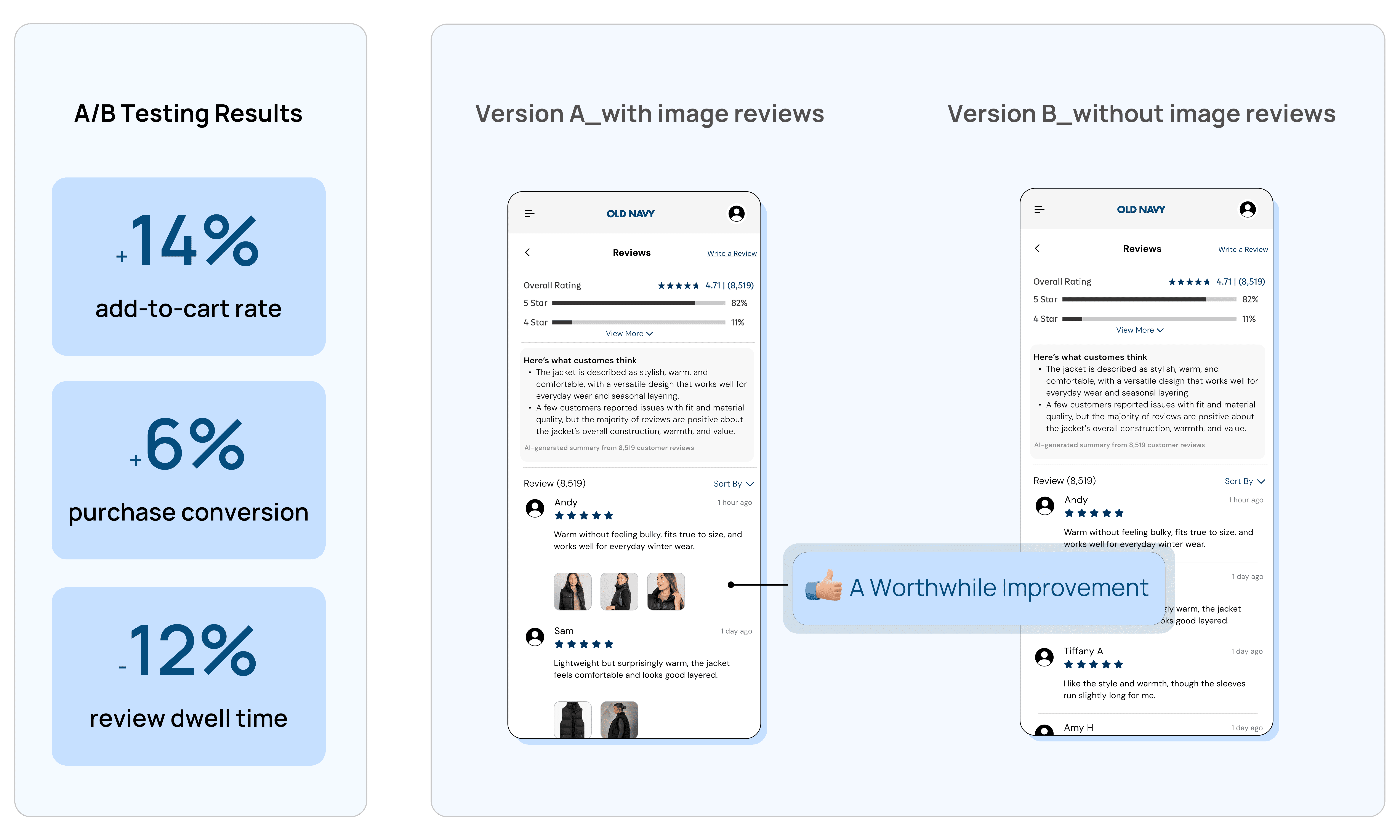 To evaluate this risk, an A/B test was conducted comparing text-only reviews with image-based reviews during the pre-checkout evaluation stage.