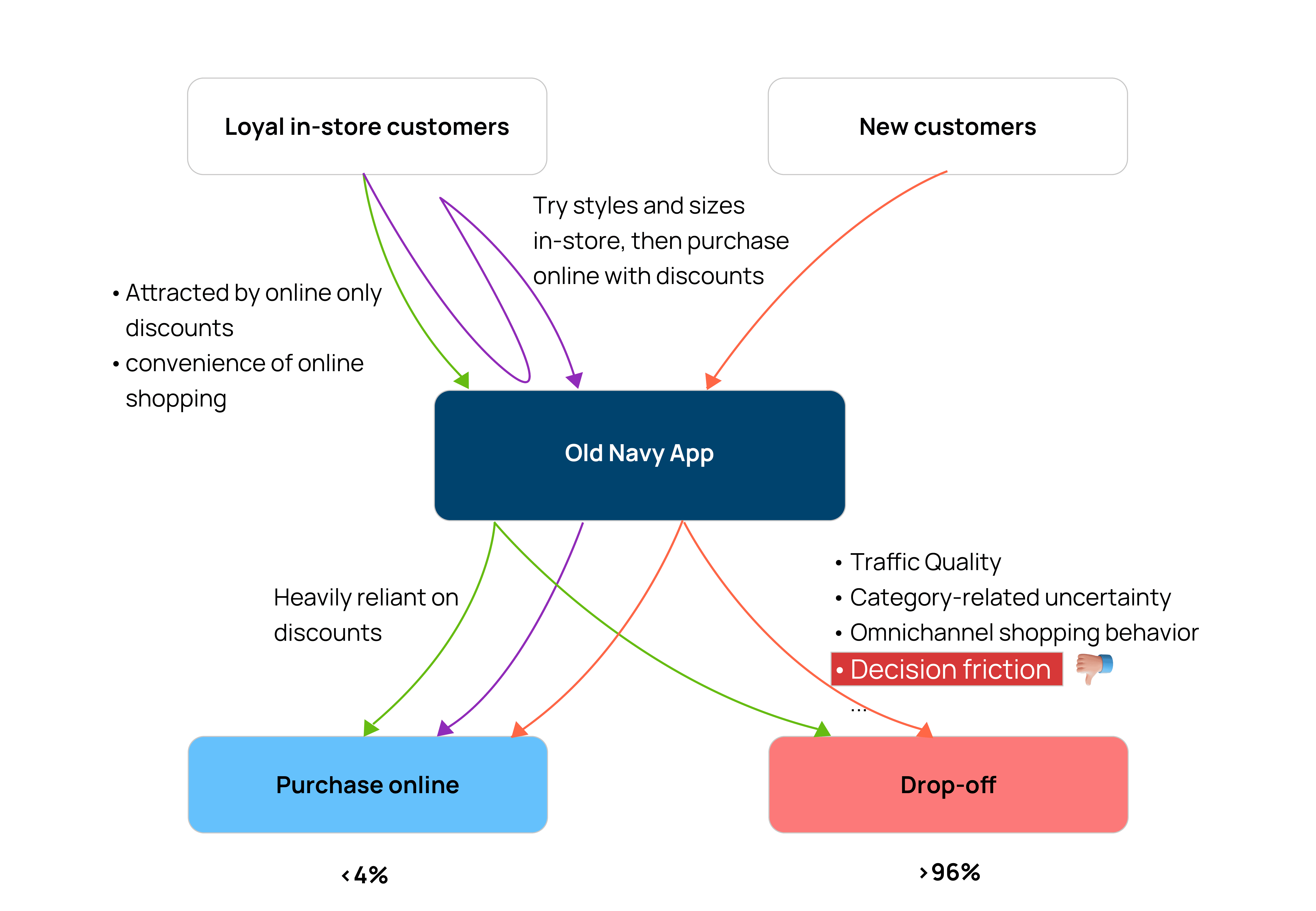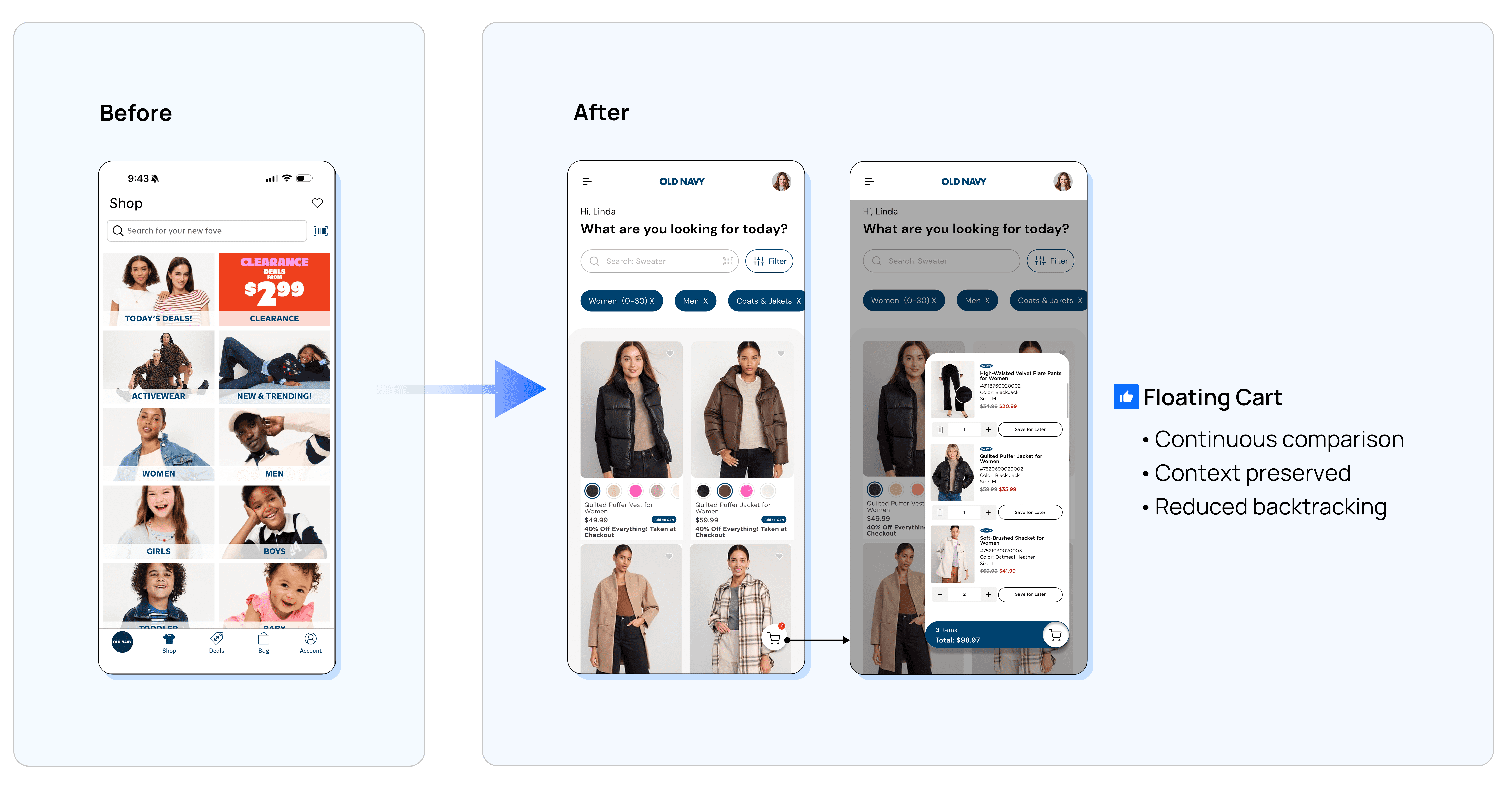 This project challenged my initial assumption that improving conversion was primarily about optimizing interfaces. Through behavioral analysis and usability testing, I realized that the real issue was not usability, but decision support. Old Navy’s users are not casual browsers; they are goal-oriented shoppers making high-stakes decisions for their families. Designing for them meant shifting focus from exposing more options to actively reducing uncertainty, fatigue, and cognitive effort.