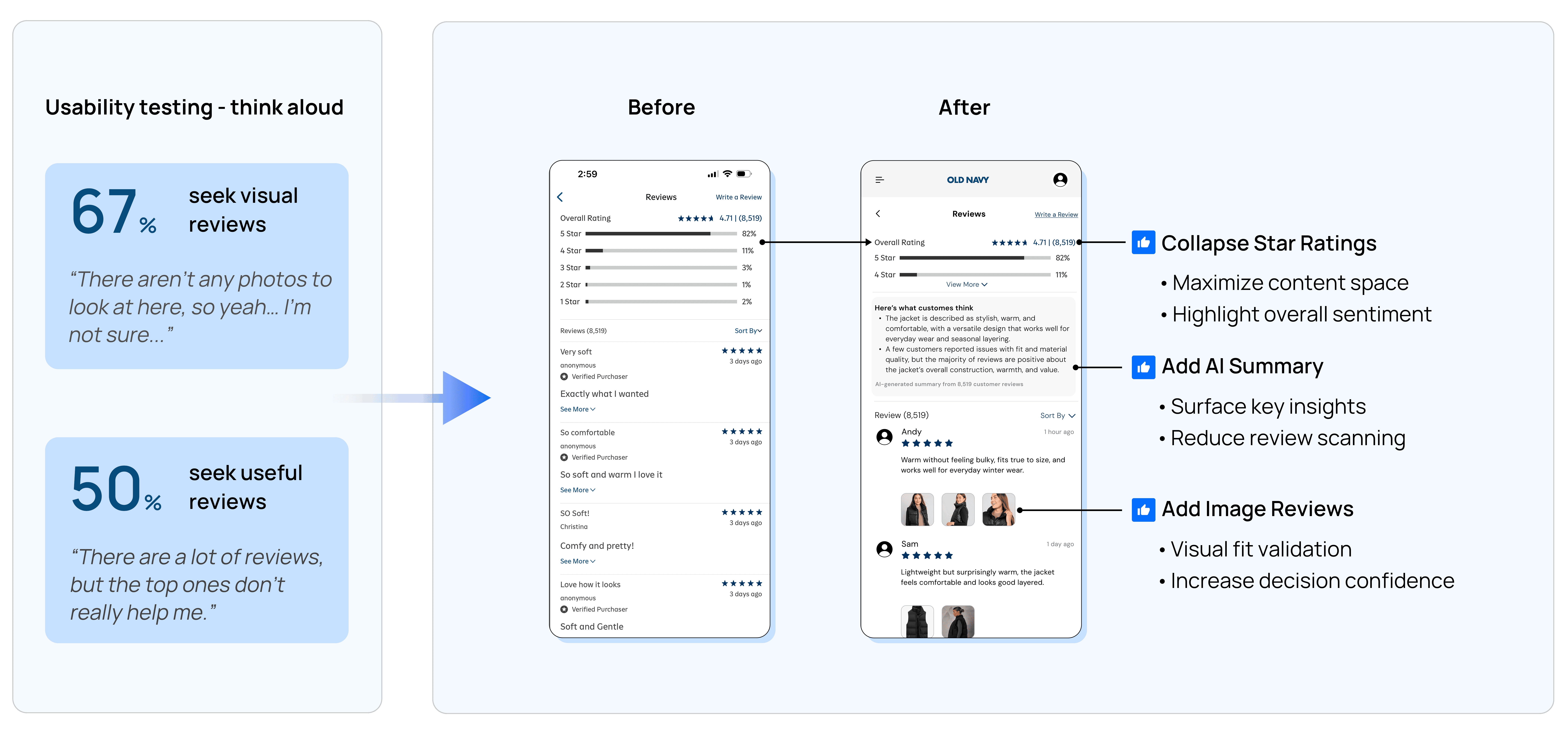 During usability testing, users frequently noted the lack of visual references in reviews and reported difficulty navigating a large volume of text-heavy feedback that often failed to address fit and quality.